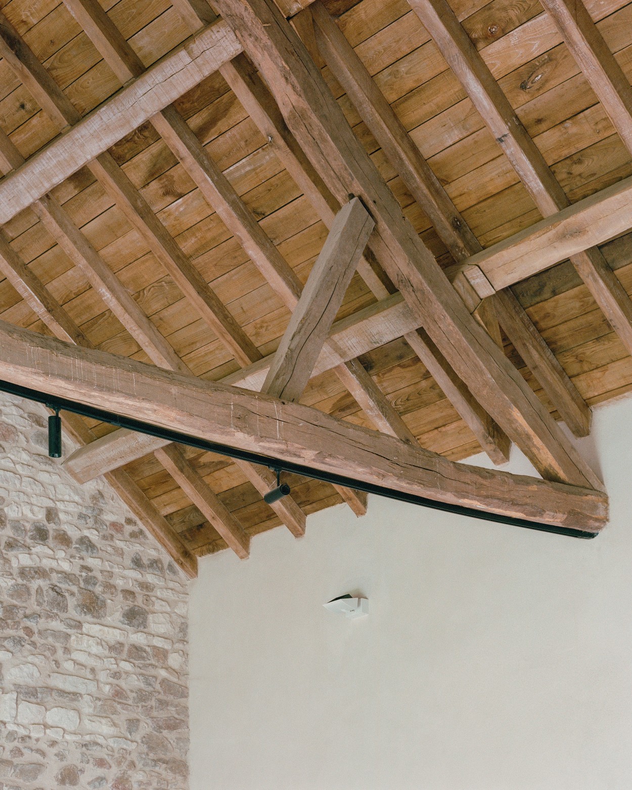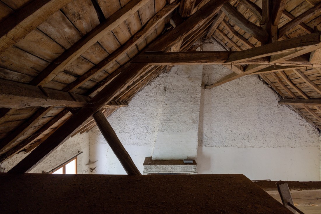Pentru a realiza acest lucru, am optat în primul rând pentru o atentă și subtilă reabilitare, care să asigure continuitatea unei culturi de construire tradiționale în detrimentul intervenții brutale. Din acest motiv, am pus accentul pe utilizarea materialelor locale, procesate minimm și a tehnicilor artizanale, inspirate de măiestria folosită în construcția originală a clădirii în urmă cu două sute de ani. Zidurile de piatră au fost stabilizate prin rostuire cu var și reparații punctuale folosind pietre tăiate, apoi acoperite cu izolație din var și cânepă, finisate cu un amestec de var și nisip. Structura existentă, păstrată până la contrafișe, a fost completată cu noi grinzi de stejar, căpriori și dulapi, tratate pentru a asigura un aspect unificat între părțile vechi și noi.