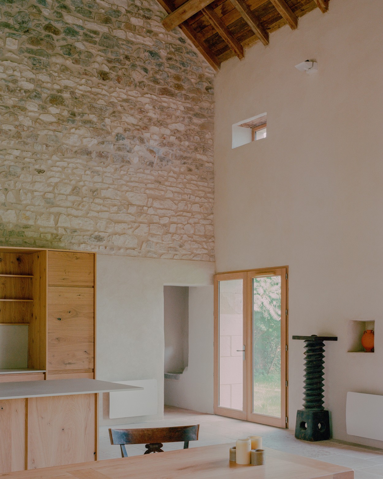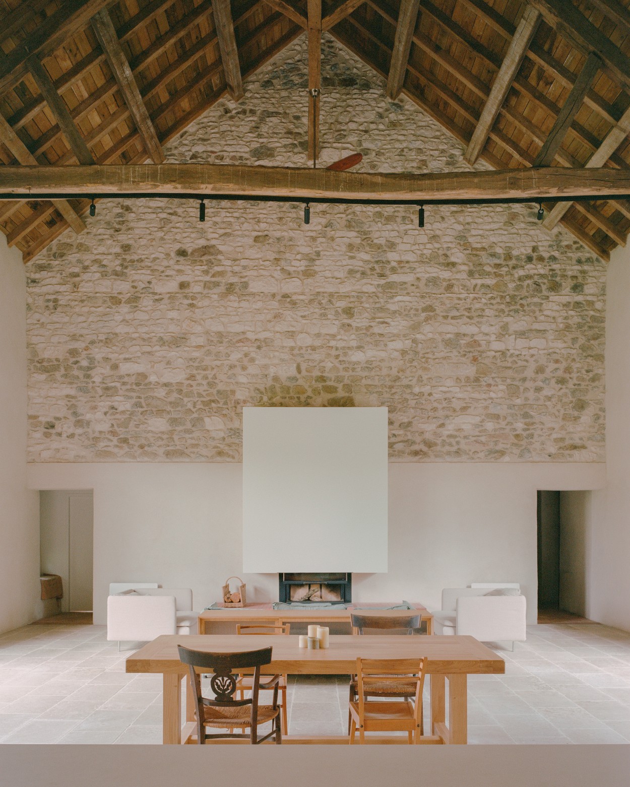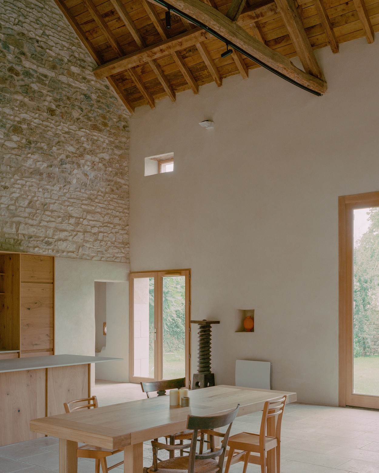 Transformarea acestui edificiu agricol într-un loc de adunare al familiei, a necesitat crearea unui spațiu central mare unde întreaga familie să se poată reuni. Prin urmare, am îndepărtat peretele grajdului care împărțea zona centrală în două, permițând un volum deschis care cuprinde spațiile comune: bucătăria, sufrageria și livingul. Pentru a deschide această zonă către grădina din spate, am creat o mare deschidere în fațada nordică, oglindind poarta existentă pe fațada sudică. Această nouă deschidere a fost realizată cu stâlpi de piatră tăiată și grinzi mari de stejar masiv. În exterior, singurele modificări la fațade au fost adăugarea de obloane de lemn albe și ferestre de stejar vitrificate, în timp ce învelișurile exterioare existente și pietrele expuse au fost intenționat lăsate așa cum erau.