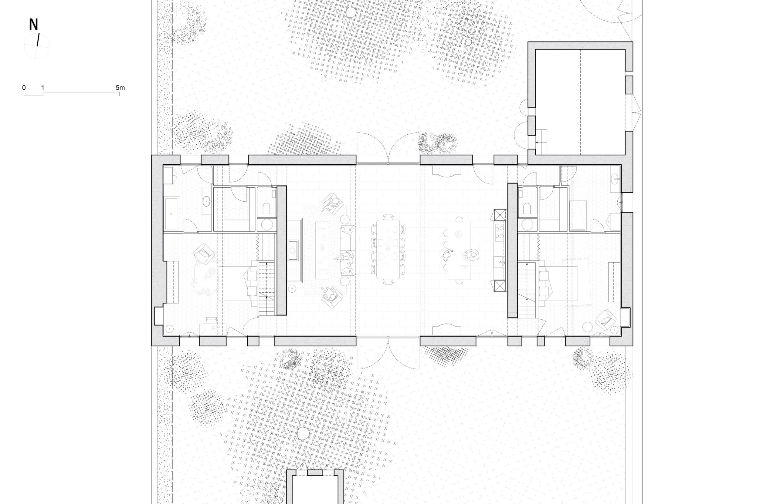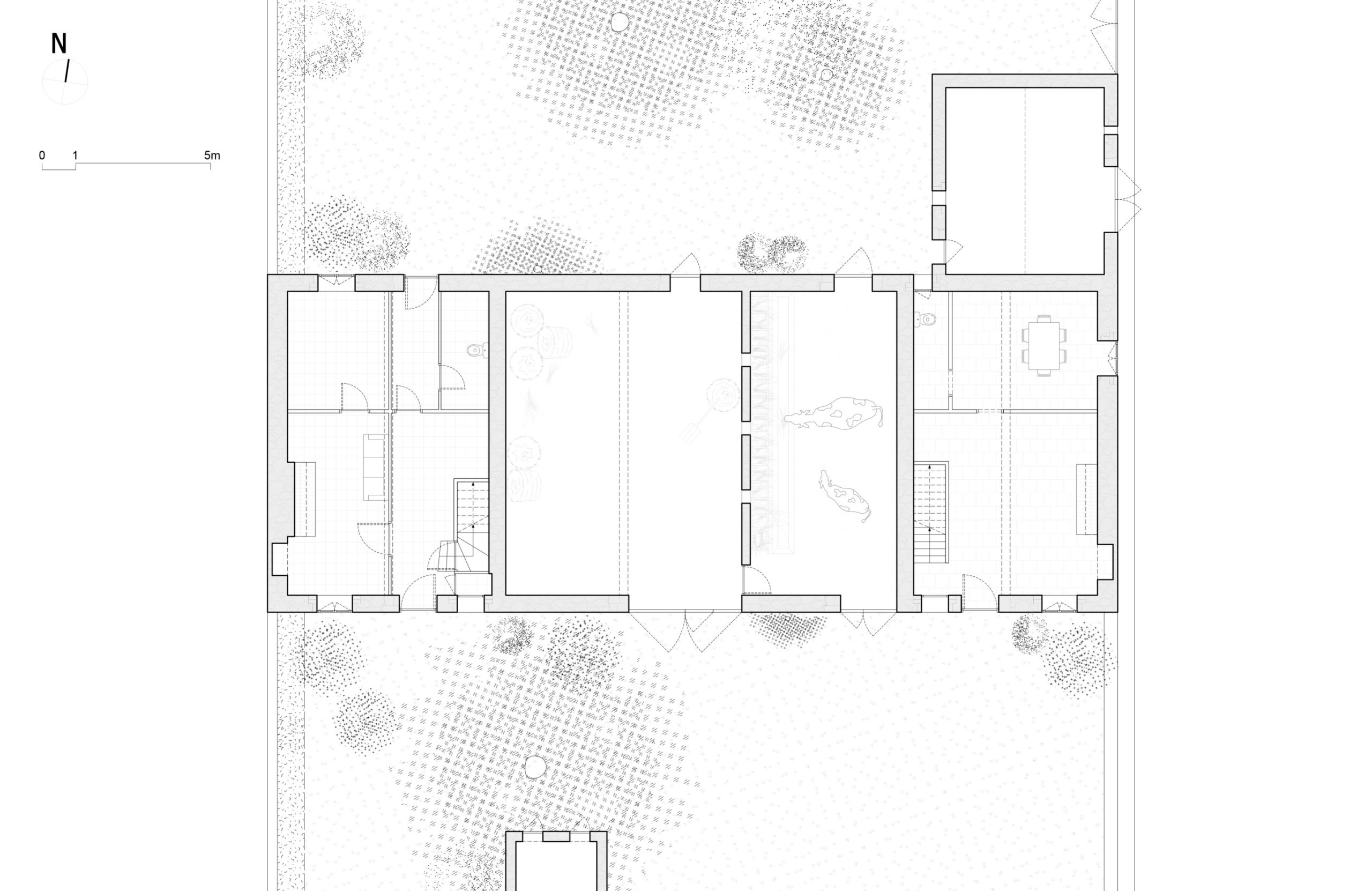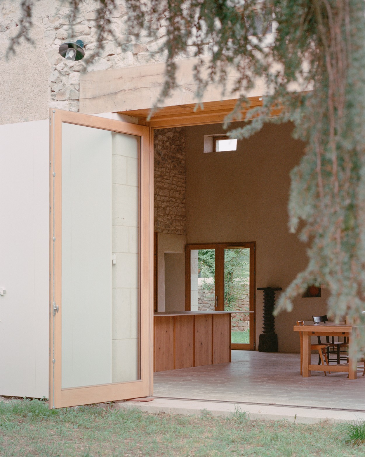 Transformarea acestui edificiu agricol într-un loc de adunare al familiei, a necesitat crearea unui spațiu central mare unde întreaga familie să se poată reuni. Prin urmare, am îndepărtat peretele grajdului care împărțea zona centrală în două, permițând un volum deschis care cuprinde spațiile comune: bucătăria, sufrageria și livingul. Pentru a deschide această zonă către grădina din spate, am creat o mare deschidere în fațada nordică, oglindind poarta existentă pe fațada sudică. Această nouă deschidere a fost realizată cu stâlpi de piatră tăiată și grinzi mari de stejar masiv. În exterior, singurele modificări la fațade au fost adăugarea de obloane de lemn albe și ferestre de stejar vitrificate, în timp ce învelișurile exterioare existente și pietrele expuse au fost intenționat lăsate așa cum erau.