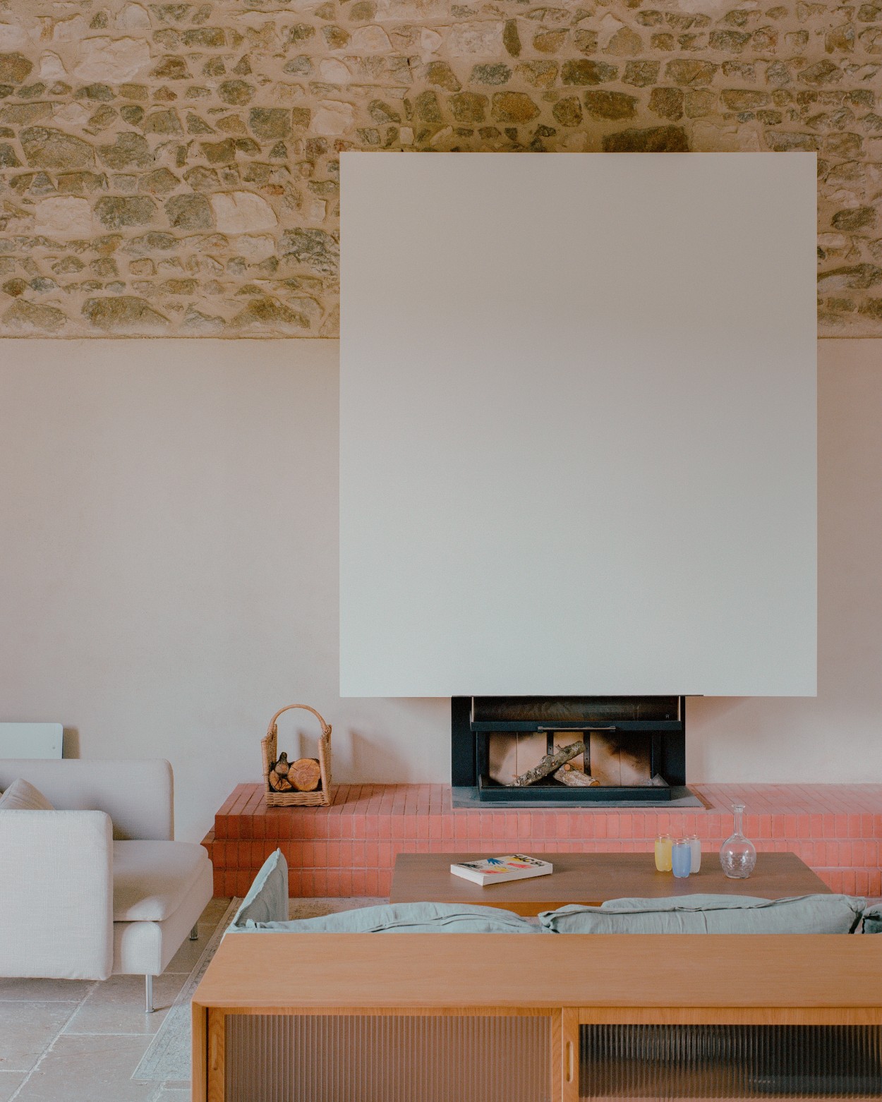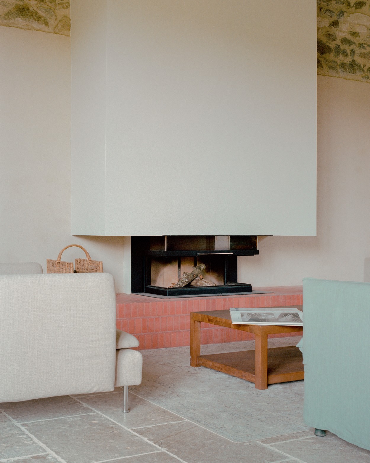 How did Axel Cornu and Gabriel Verret manage to do this, transforming an ordinary farm building, two centuries old[3], into a family home? By ordering the spatial-temporal elements, fixing and centering them for coherence, on the one hand, and by re-composing and reassembling the stylistic and functional elements, orienting and directing them for consistency in expressiveness and discourse, on the other. I don't know if the two axes of symmetry were deliberately introduced as part of the composition's structure or if they are the result of a symmetrical cut with the barn door, the demolition of the separating wall of the stable, and the arrangement of the unique resulting space which includes the kitchen, dining room, and living room, lined up and centered on the same direction. I also don't know if these axes existed, in some form or another, latently in the initial construction. In the end, it is less important to know their origin; what remains significant or becomes significant is their meaning and purpose in the realized project. Thus, there is an axis in the south-north direction that traverses the house and disappears into the horizon, a visual axis that opens the interior space to the exterior countryside landscape of the high plateau of the Massif Central. The second axis, short, perpendicular to the first, is an interior one and centers and orders the interior space. It also supports a vertical plane of symmetry, a third axis, the vertical one, which introduces and integrates the temporal and cultural dimension of the place as well as the fire.