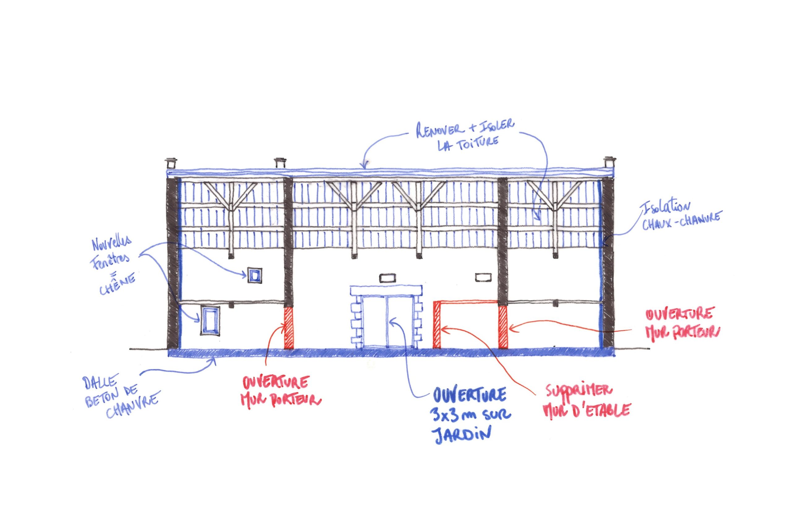 Scopul acestui proiect a fost transformarea unei ferme vechi într-o casă de familie în Chamboirat, un mic cătun din zona rurală a Auvergnei. Acest hambar vechi de două secole era un patrimoniu agricol comun în această parte a Franței. Odată intrați, am descoperit caracterul excepțional al acestei construcții: ziduri de piatră de 9 metri înălțime, o structură de lemn complexă și volume fantastice. Întregul loc evidenția o materialitate remarcabilă. Când clientul nostru ne-a împărtășit dorința sa de a transforma locul într-o casă în care să se adune familia pentru mulți ani, am fost de acord că această intervenție ar trebui să respecte în primul rând caracterul distinctiv al locului.