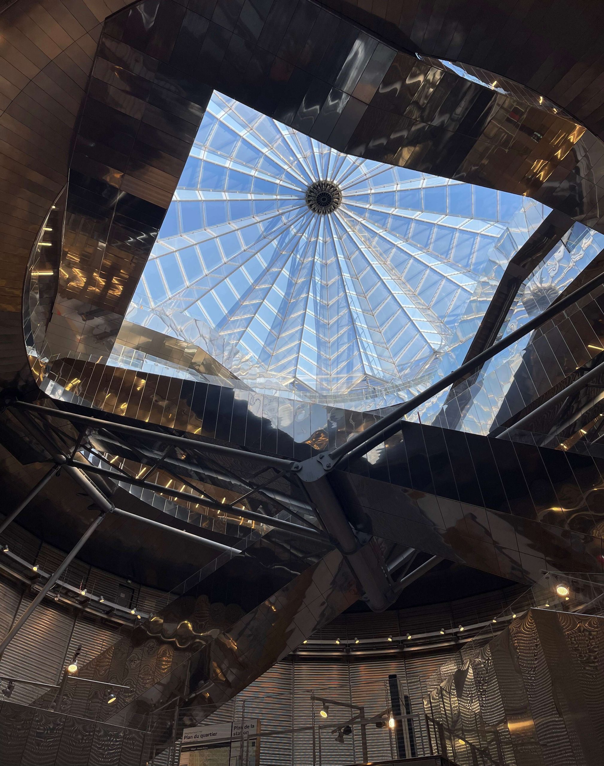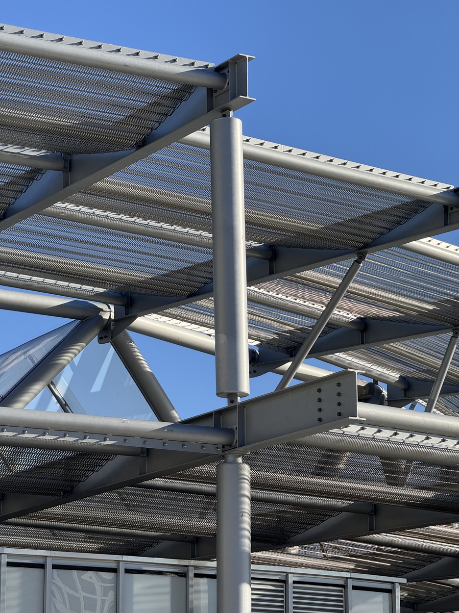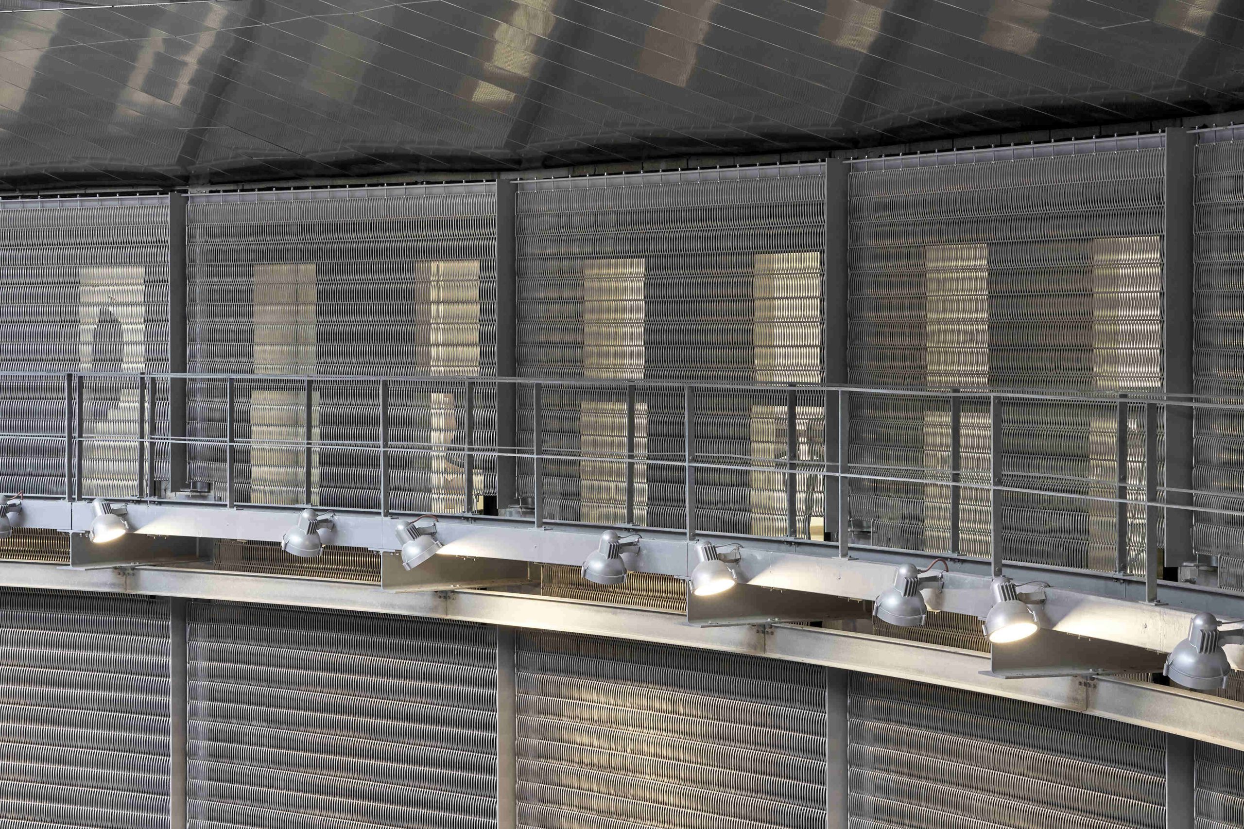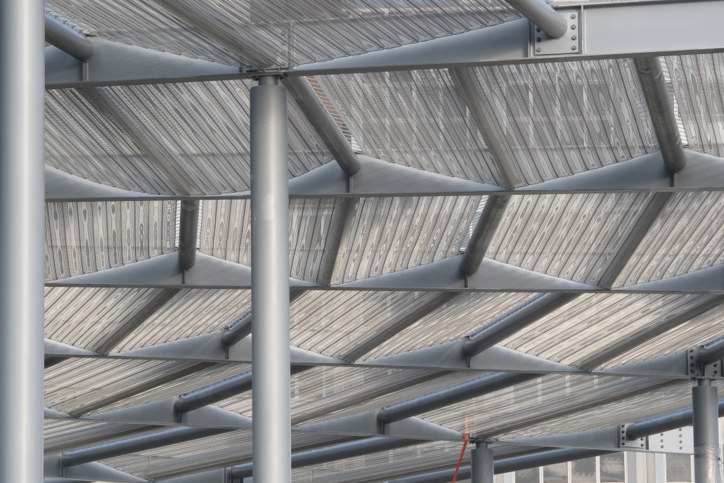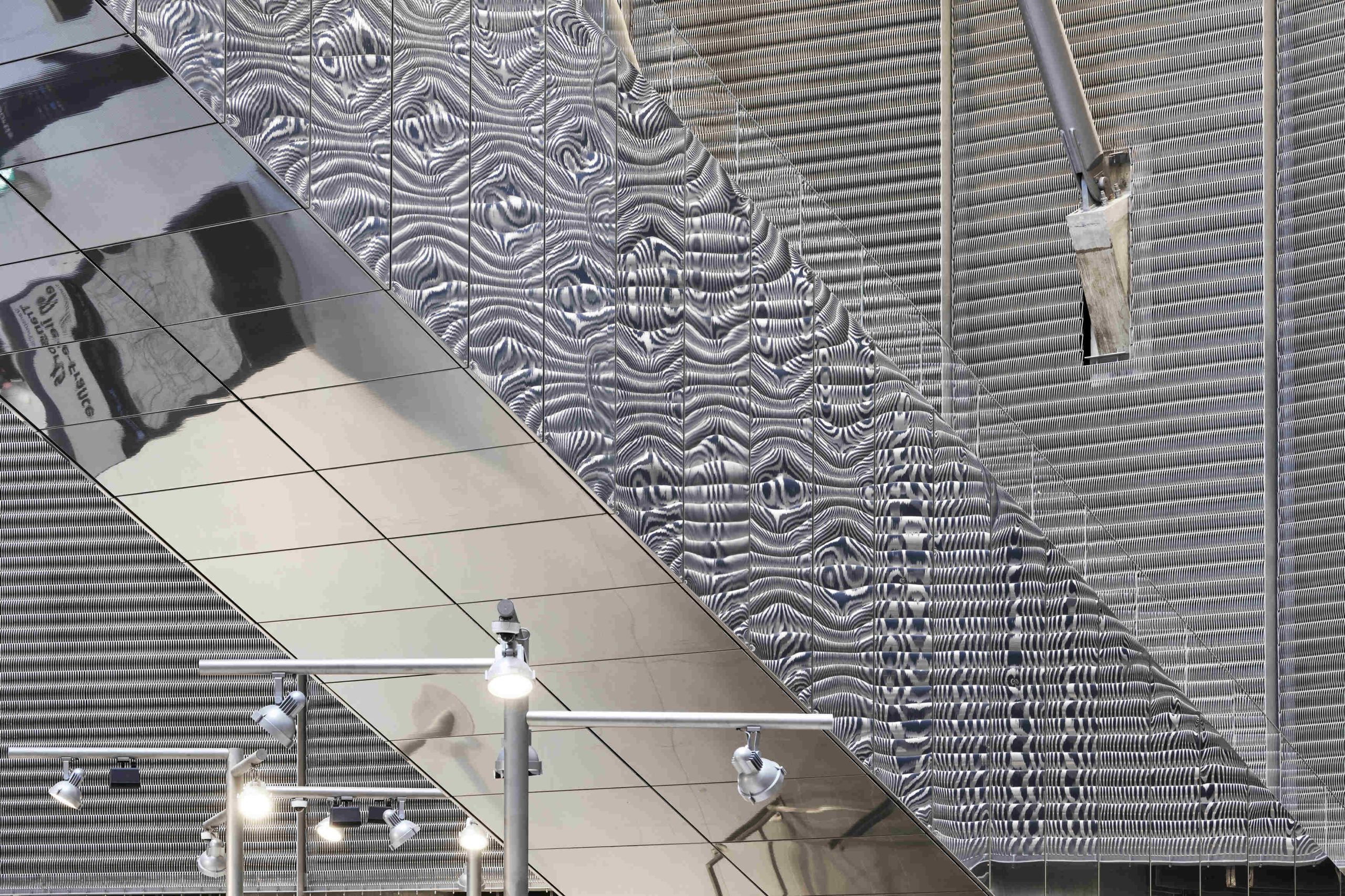 Discuri cu o suprafață de 3.273 m², compuse din fâșii de plasă spiralată din oțel inoxidabil, întinse între grinzi radiale, structurează acoperișul exterior. În interior, 1.808 m² de sârmă de aluminiu argintie îmbracă marele puț, electrizând astfel inima stației. Inițial un produs industrial, considerat anterior rece și rigid, plasa metalică primește o nouă funcțiune: nici zid, nici structură, este folosită pentru a regândi noțiunea de protecție și acustică, a dematerializa volume, a introduce jocul cu iluminarea și reflexia și pentru a îmbrăca aici și colo stația și instalațiile sale.
