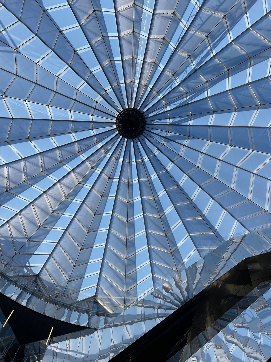 Acoperișul stației este compus din trei straturi. Un strat central transparent circular protejează de ploaie permițând în același timp aerului exterior să circule lateral. Acest acoperiș constă dintr‑o grindă periferică pe care sunt legate toți tiranții și toate cablurile cu butucul central, „ochiul” stației. Întinse peste cabluri sunt elemente din ETFE (etilen‑tetrafluoretilenă), material ales pentru calitatea înaltă a transparenței, greutatea redusă, rezistență și foarte mare finețe. Alte două acoperișuri, discuri neconcentrice plasate la două înălțimi diferite, acoperă stația. Ca două mari corturi, iradiază peste forecourt și marchează prezența stației asigurând totodată protecția utilizatorilor împotriva soarelui, ca niște umbrele peste spațiul public. Ele sunt compuse din benzi de plasă metalică din oțel inoxidabil în spirală, întinse între grinzile radiale.