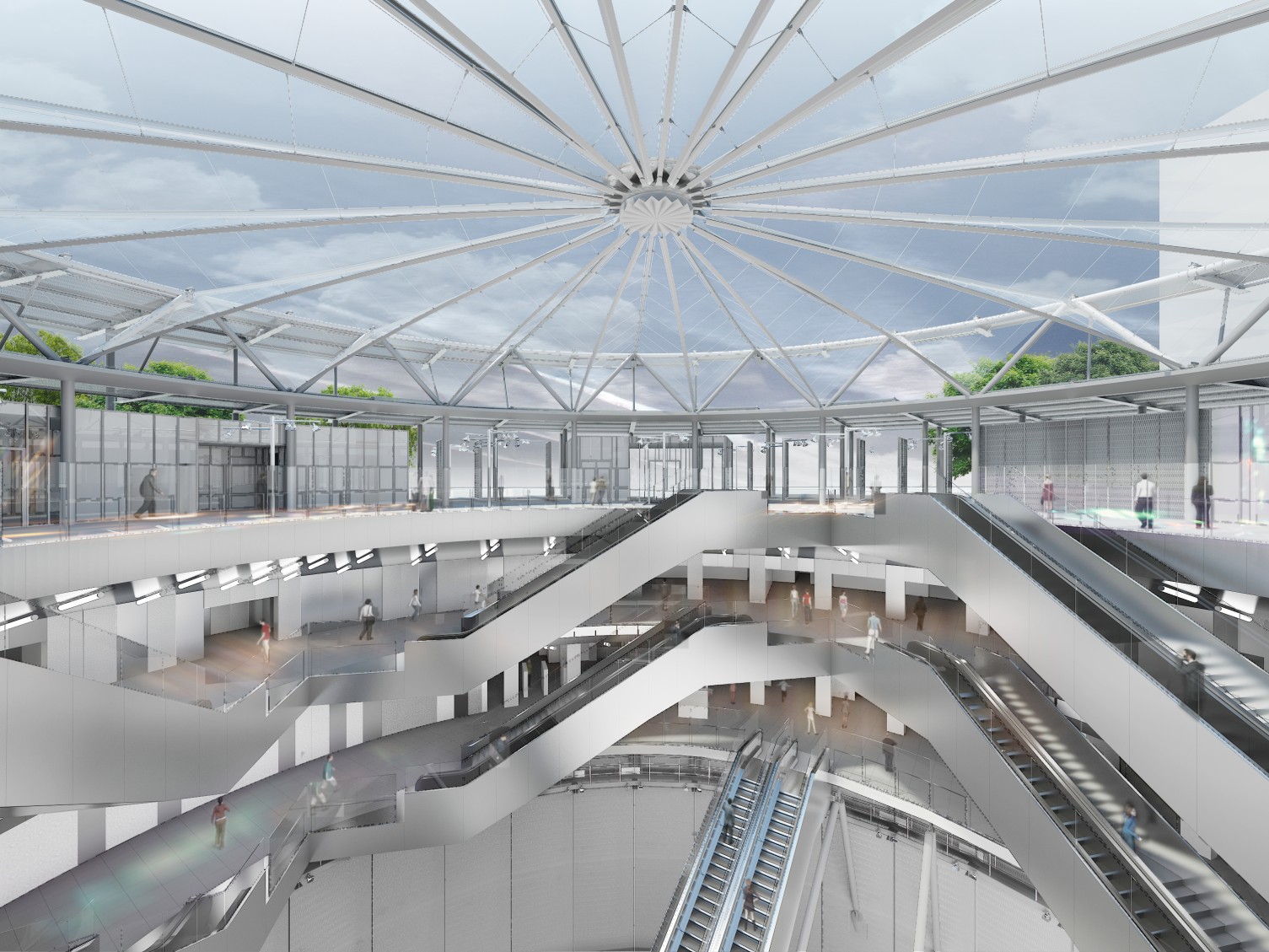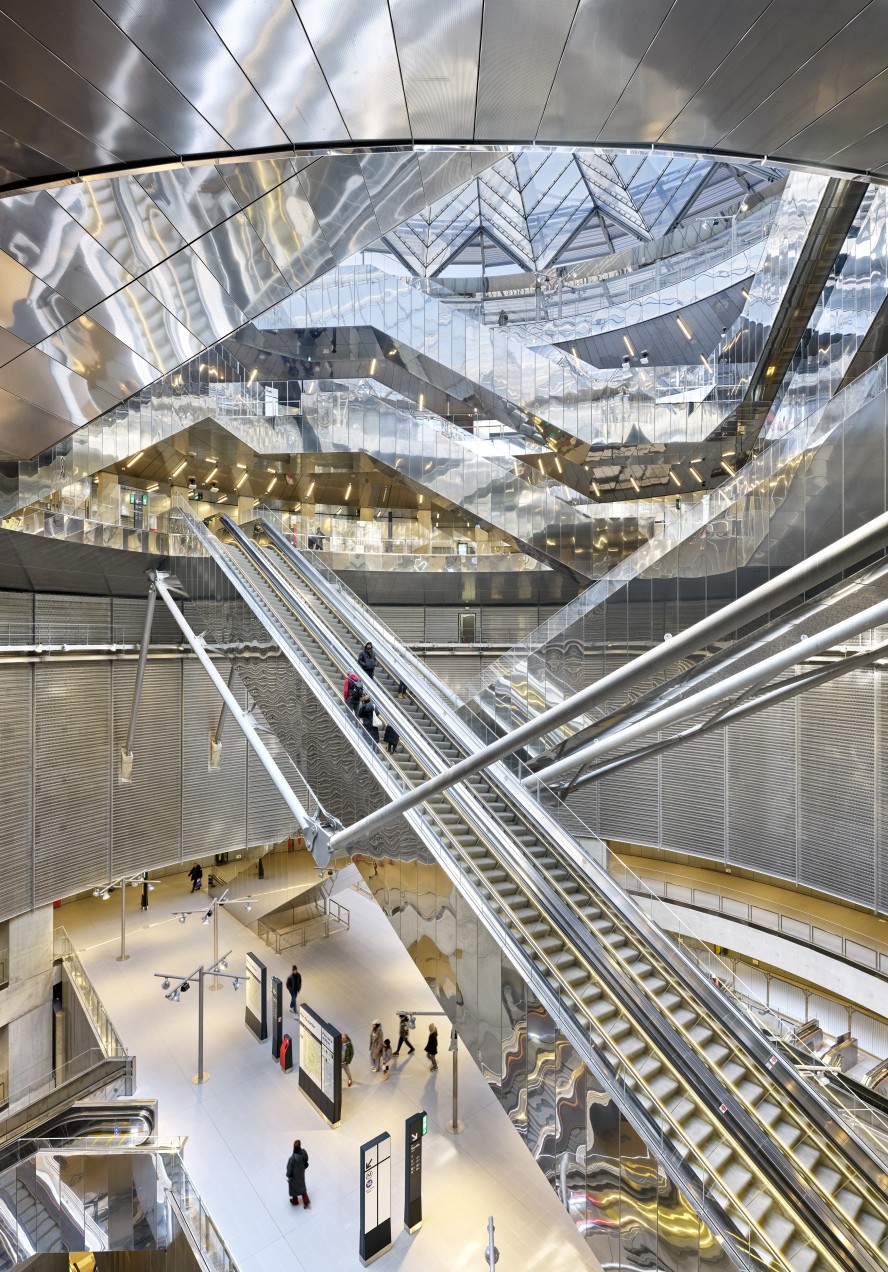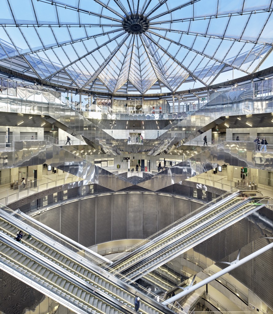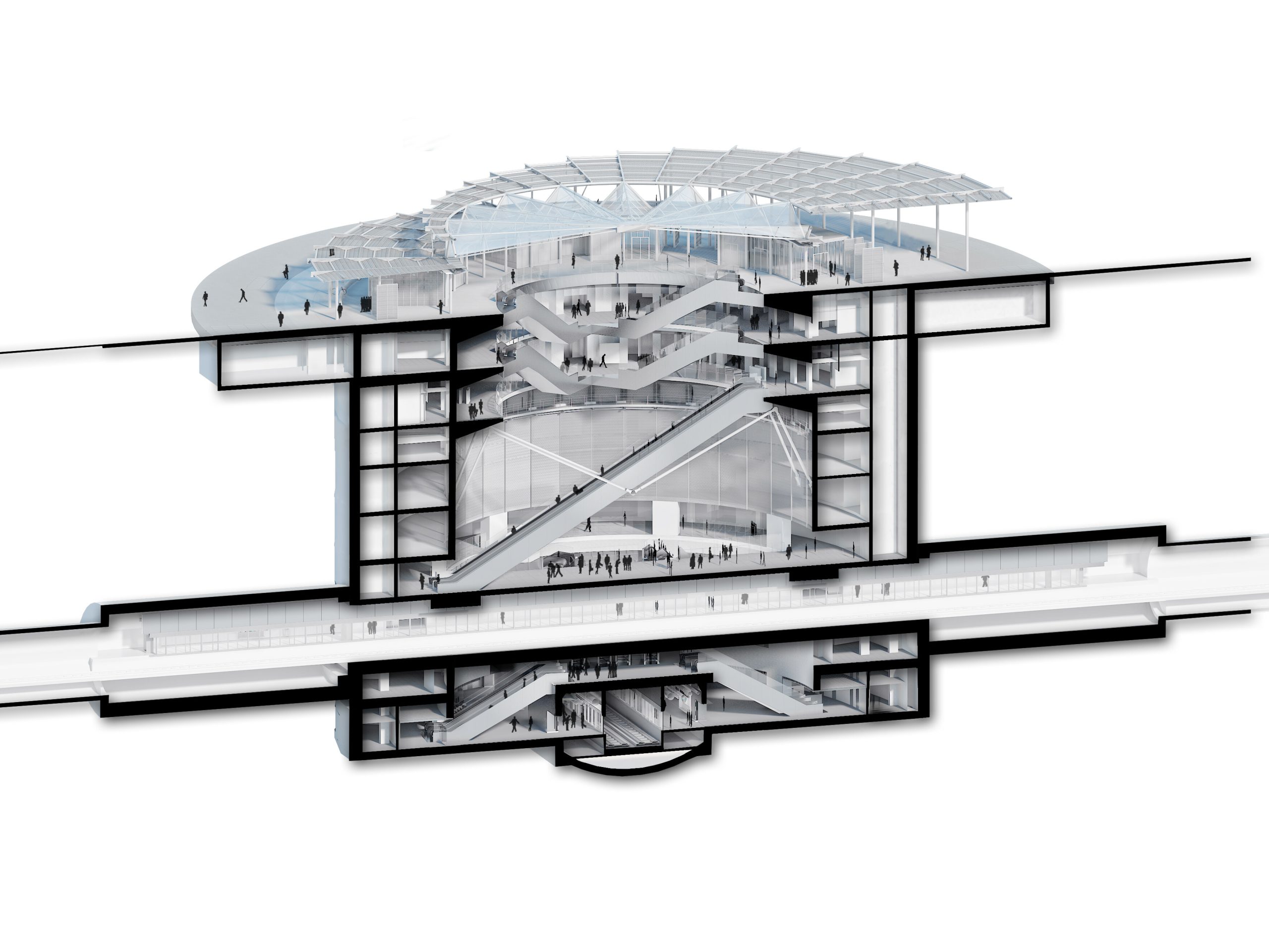 Un spațiu generos, stația se întinde, degajă și infiltrează subteranul, ca o extensie a orașului sub pământ. Arhitectura sa este gândită în continuitatea spațiului public înconjurător. Nu se opune orașului, nu stă împotriva lui și nu ridică nici un fel de barieră (fațadă sau zid) față de el. Această stație trebuie înțeleasă ca un conector între lumea de dedesubt și lumea de deasupra, și invers. Este un mare cilindru deschis, gol, cu un diametru de 70 de metri. Un gol interior de 30 de metri, înconjurat de galerii și balcoane, găzduiește marile scări rulante. Studiile inginerești au fost dezvoltate astfel încât proiectarea infrastructurii să corespundă proiectării stației: o arhitectură luminoasă și ușor de citit, care însoțește fluxurile cât mai natural posibil.