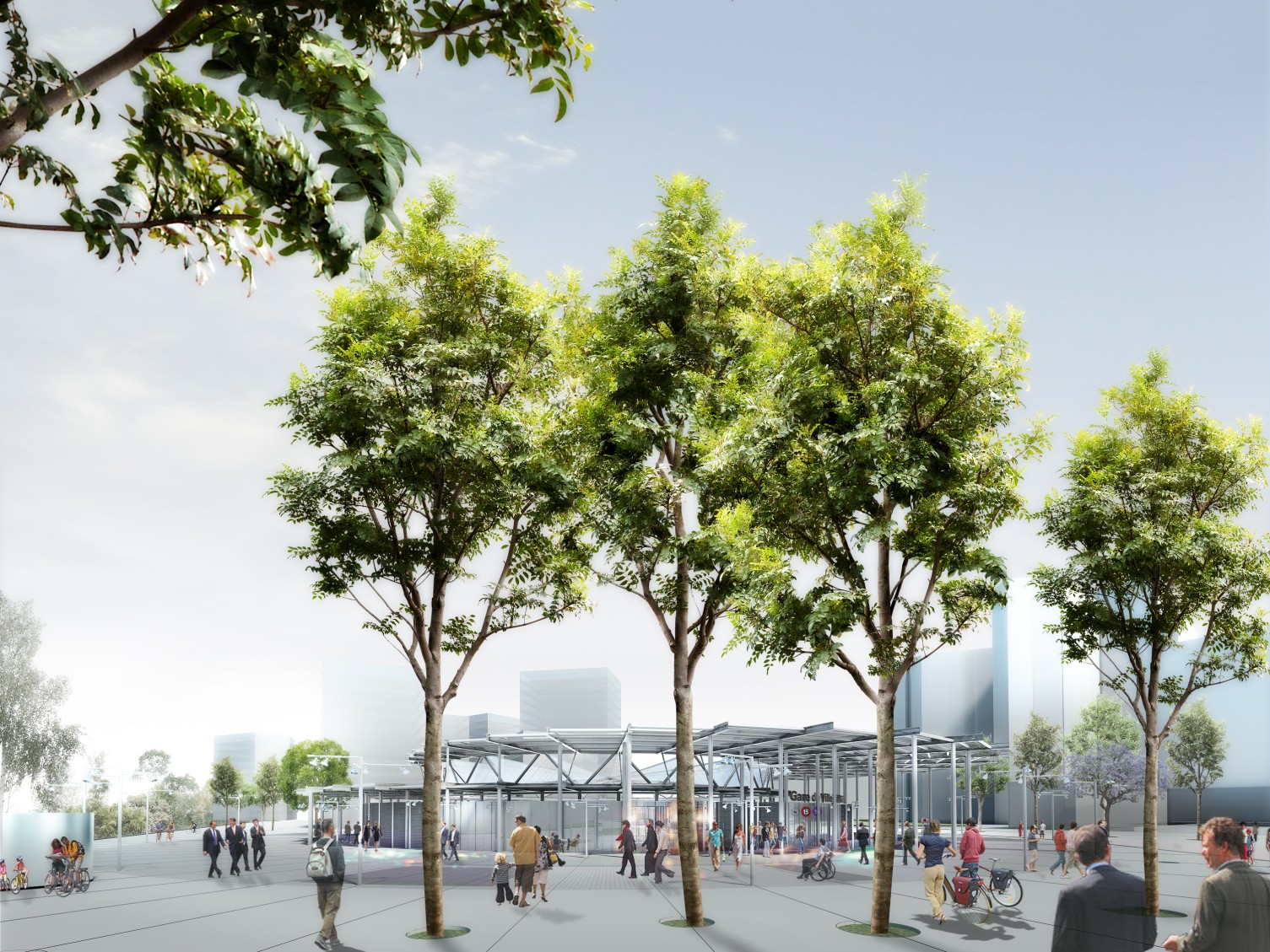 La nivelul pieței, forecourt‑ul conduce natural către primul balcon cu vedere spre golul central. Câteva chioșcuri găzduiesc diverse servicii și punctează periferia stației. Pereții acoperiți cu plasă metalică permit închidere stației. Aceste elemente sunt o formă ușoară de limită care oferă vedere spre oraș și parc.