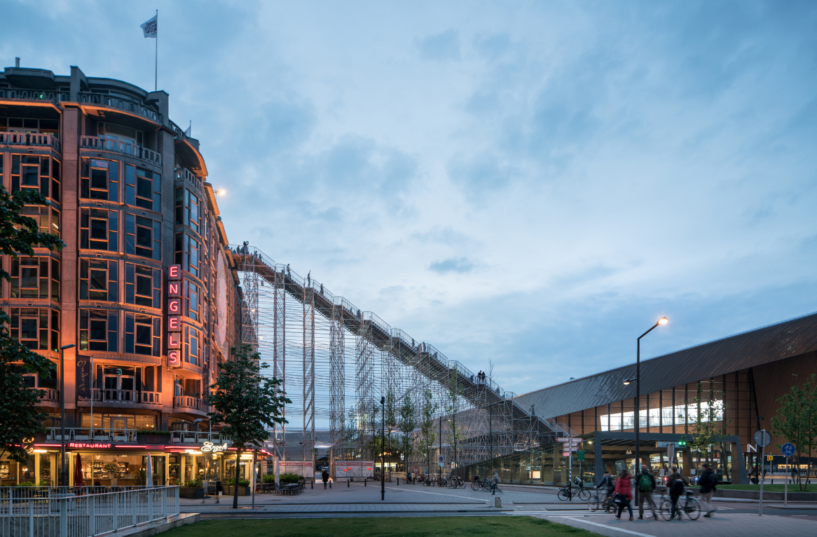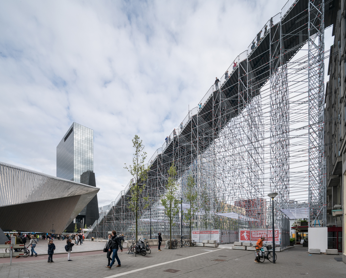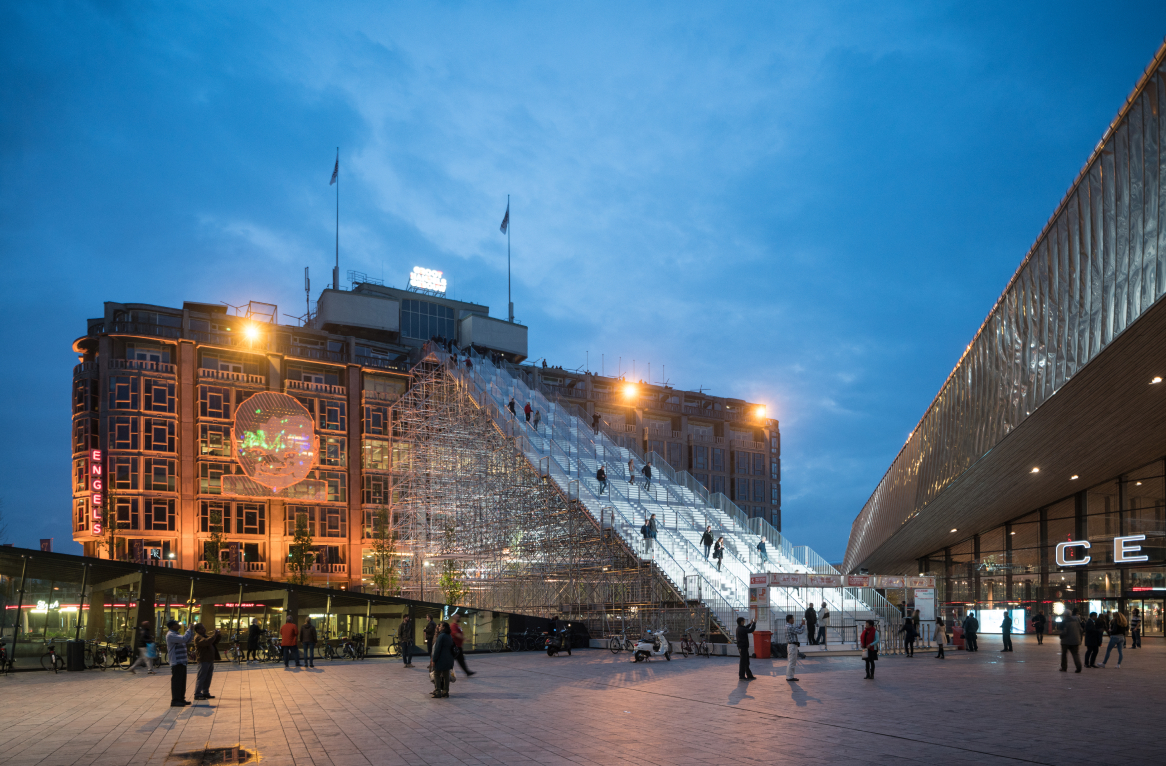 The Stairs to Kriterion are a nod to 75 years of rebuilding Rotterdam. The scaffolding responds to the angles of the Rotterdam Central Station, connecting the contemporary icon with a historic monument, whilst through its construction referencing the reconstruction that the city has experienced.