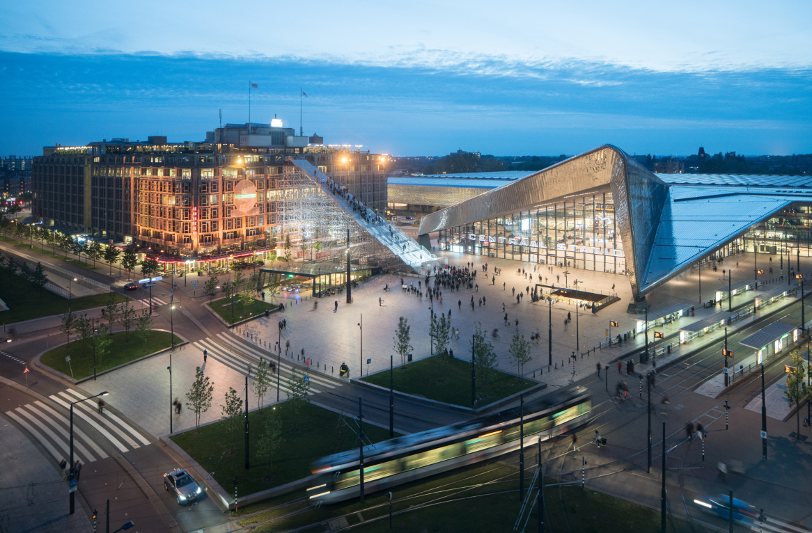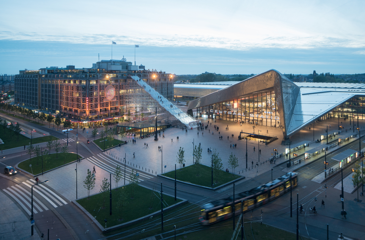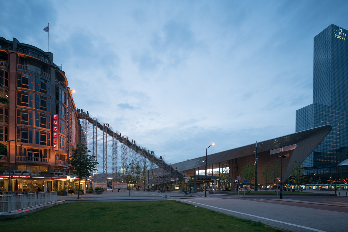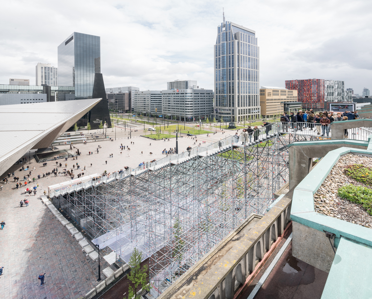 The Stairs to Kriterion are a nod to 75 years of rebuilding Rotterdam. The scaffolding responds to the angles of the Rotterdam Central Station, connecting the contemporary icon with a historic monument, whilst through its construction referencing the reconstruction that the city has experienced.