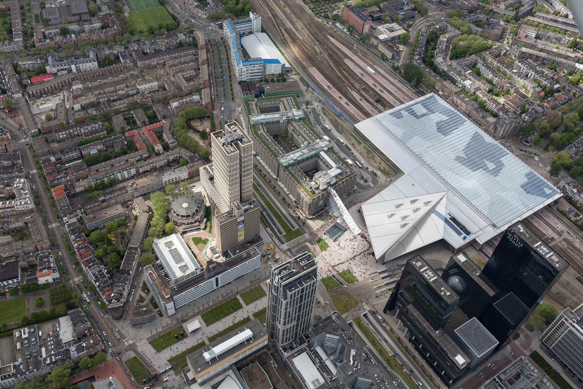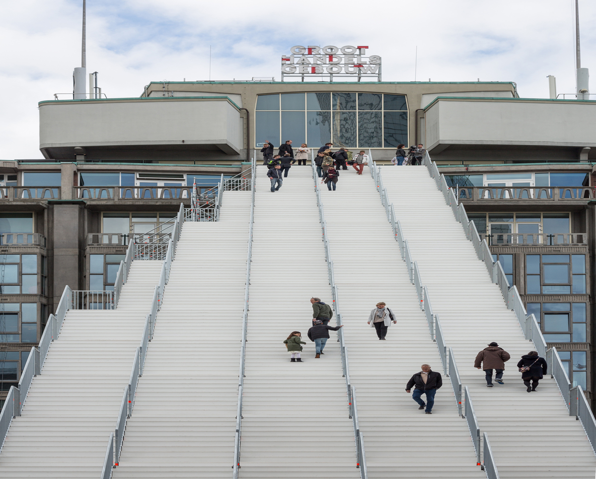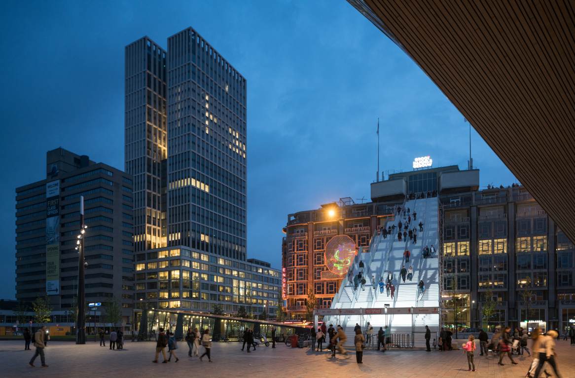 Am creat un nou punct de belvedere unde oamenii pot savura priveliștile unice ale acestui oraș recent reconstruit. De la macaralele din port până la noul centru al orașului, la nord și la Grădina Zoologică Blijdorp. Treptele oferă nu doar o succesiune de perspective asupra orașului pe măsură ce urci, ci și accesul la acoperișul Groot Handelsgebouw. Odată ajuns în vârf, o platformă de observație temporară îți oferă posibilitatea de a privi deasupra întregului oraș. Pe acoperiș se află și fostul cinematograf Kriterion, popular în anii 1960, care a fost redeschis special pentru eveniment pentru a oferi o varietate largă de filme, dezbateri și reprezentații. Vizitatorii au putut, de asemenea, să se bucure de facilități pentru recreere și să afle mai multe despre oraș și dezvoltarea sa la punctul de informare dedicat evenimentului cultural.